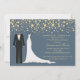 Ouro confetti, Tuxedo e vestido de casamento contra um Convite para Chá de Casal de fundo azul.