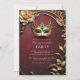 Experimente uma noite de encanto e elegância com este convite de Mascarada Ball. Esta design mostra um fundo de cor vermelha de carvão vegetal adornado com decoração falsa de ouro, folhagem 3D e uma máscara de mascarada cativante.