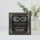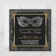 Os invitationss elegantes, do doce 16 do preto, da prata e do ouro de mascarada da bola da festa de aniversário com falso foil, ouro que chique os rolos metálicos do olhar decoram os cantos contra um fundo do preto do carvão vegetal com quadro do quadrado do olhar do metal do ouro do falso e dispersado, olhar do falso dos acentos de prata dos confetes da beira dos pontos dos confetes da folha de prata do falso. Uma cor de prata metálica, design da máscara da bola de mascarada decora a parte superior. Lê juntam-se por favor à bola de mascarada que honra dentro com o nome personalizado abaixo no roteiro chique. O outro doce personalizado dezesseis party detalhes abaixo, incluindo a informação de RSVP. Texto na cor de harmonização da prata e do ouro. As cores e os estilos de texto podem ser mudados para seri-lo. A parte traseira tem rolos de harmonização do ouro nos cantos com o fundo do preto do carvão vegetal dispersado com olhar de prata dos confetes. Nota: Todas as imagens são imprimidas. Metal, folha, ou confetes nao reais. Bonito para o preto e o tema do ouro, festas de aniversário da prata e do ouro as 16os ou estilos do art deco, assim como grandes temas do encanto de Gatsby.