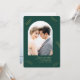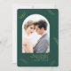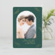 Este moderno convite de casamento de duas fotos apresenta uma elegante impressão de simples wisps de cor de ouro em um belo fundo verde esmeralda. A frente inclui uma fotografia em forma de arco geométrico de tendências, e a parte de trás é uma foto de cheio sangrada do casal feliz.