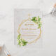 Este convite de batismo floral geométrico elegante tem uma moldura dourada irregular com buquês de lírios brancos (e outras flores brancas menores) para cima e para baixo à esquerda sobre dois hexágonos dourados que se sobrepõem a um fundo de mármore branco, com uma cruz dourada no topo. O nome da criança é escrito em uma fonte caligráfica elegante. Todo o texto tem uma cor amarela dourada, como a moldura dourada.
