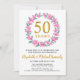 Este convite para o seu 50º aniversário de casamento apresenta uma delicada coroa floral verde (garland) feita de flores rosadas e folhas verdes esmeraldas. O convite pode ser facilmente personalizado com as suas informações especiais sobre renovação de votos de ouro. A parte de trás do convite mostra as datas de aniversário no elegante texto branco sobre o fundo do ouro. Os materiais de festa e artigos de papelaria estão disponíveis na coleção "50º Aniversário de Casamento Flores Rosa e Cartões de Ferro e Suprimentos de Partido".