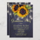 Modelo de convite para na moda de festa de formatura de estilo russo na meia-noite escura no fundo do quadro azul de marinho apresentando grandes buquês de girassol de ouro amarelo e cordas de luzes cintilantes. Preencha suas informações nos pontos, Você pode optar por personalizá-las mudando ainda mais as fontes e as cores das letras. — O convite é adequado para festas noturnas de graduação de jardim/quintal rústico. — Se precisar de assistência, por favor, entre em contato comigo!