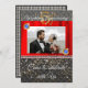 Convite Chic Preto e Dourado com seda vermelha apresenta a fotografia do casal. A imagem é decorada no canto superior esquerdo e inferior direito com um broche de Diamantes Safira dourado e azul.