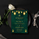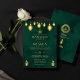 O Ouro Real Emerald Verde Ilumina O Convite De Casamento Islâmico. Este convite, uma sinfonia de elegância, desenrola-se contra um pano de fundo do esmeralda verde. Uma cascata de luzes acesas iluminando o convite, criando um ambiente encantador. O convite apresenta uma elegante caligrafia de ouro, começando com a invocação sagrada "Bismillah", seguida dos intrincados detalhes da celebração do casamento. O reverso ecoa o mesmo tema, mostrando um monograma cativante dos nomes dos casais. Este convite combina perfeitamente as tradições islâmicas com um toque de talento internacional, fazer-o de uma manutenção verdadeiramente única e inesquecível para este casamento trinacional.