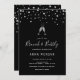 Chá de panela com falsos diamantes de prata e flautas de champanhe em fundo preto. Estes convites elegantes são perfeitos para um chá de panela clássico ou um brunch de champanhe como uma celebração de "Brunch and Bubble". Personalize com suas informações para que a noiva seja. Clique em "Clique para personalizar mais" para editar seu estilo de fonte, cor e tamanho ou adicionar caixas de texto adicionais à frente ou atrás.