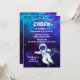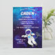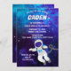 Make your child’s celebration truly out of this world with this vibrant space-themed birthday invitation! The design features a deep blue-purple galaxy background filled with stars, giving the perfect cosmic atmosphere for any little astronaut. A cheerful cartoon astronaut floats weightlessly near the bottom, adding a playful and adventurous touch kids love.