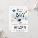Blast off for a stellar celebration! We're over the moon to announce that a baby boy is on the way. This adorable baby shower invitation is perfect for an outer space theme, featuring a cute watercolor astronaut floating through the galaxy, holding onto planet and letter-shaped balloons that spell out "BOY." The whimsical design, complete with stars and planets, sets the perfect tone for a cosmic adventure to celebrate the mom-to-be. All details are fully customizable for this out-of-this-world event!