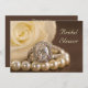 Convide convidados para uma festa pré-casamento honrando a noiva para estar com o elegante Chá de panela Oval Diamond Ring e White Rose. Este clássico chá de casamento personalizado apresenta uma fotografia floral próxima de um anel de noivado de diamante oval, colar de pérolas brancas e flor de rosa branca num fundo de seda marrom.