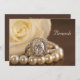Continuem celebrando a noiva e noiva recém-casada na manhã seguinte à cerimônia de casamento com o Posto Oval Diamond Ring e o Convite Branca para Casamento Rose Brunch. Este elegante personagem After Wedding Breakfast ou Luncheon Invite apresenta uma fotografia floral de um anel de noivado de diamante oval, colar de pérolas brancas e flor de rosa branca com um fundo de seda castanha.