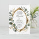 Este convite é especial por sua moldura geométrica tridimensional que adiciona uma profundidade luxuosa e moderna. A impressionante estrutura dourada proporciona um toque contemporâneo, perfeitamente equilibrado pelas folhas de eucalipto suaves e naturais em aquarela. É ideal para um casamento sofisticado, de alta classe ou rústico moderno que busca um charme sofisticado.