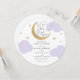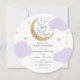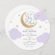 Baby Shower invitation featuring watercolor purple clouds and stars with gold glittery moon and fun script "We are over the moon!" Personalize with your information or click "click to customize further" to adjust font type, size, color.