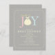 Um convite de chá de fraldas neutro que inclui a frase "Pacote de Alegria" com uma ilustração de um conjunto de bolinhas amarelas incorporado em letras multicoloridas. Personalize o texto com detalhes da sua ocasião.