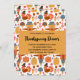 Um convite Jante de Ação de Graças com um padrão de queda sazonal, Milho, cogumelos e flora. Junto com perus e espantalhos para honrar a tradição de Ação de Graças.