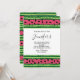 Convite de aniversário com um padrão de melancia fofo. Casca verde em camadas de listras junto com uma camada de listras cor-de-rosa com dentro de sementes pretas. Diversão e design de verão.