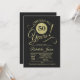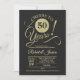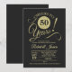 Convite de festa de 50º aniversário em preto e dourado. Cartão de convite elegante com padrão de quadro de giz e fonte de letra de caligrafia. Saúde por 50 anos! Perfeito para uma celebração de aniversário de cinquenta anos dourada e sofisticada.