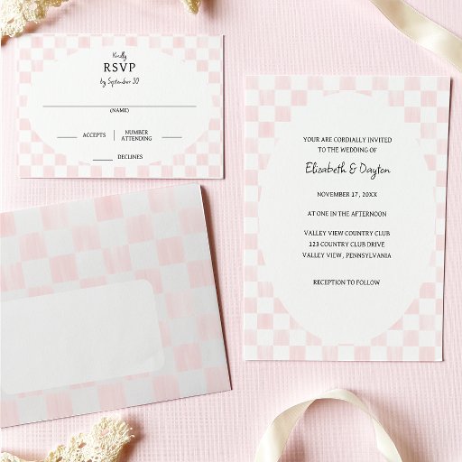 Convites Padrão de Xadrez Pintado de Rosa Casamento