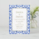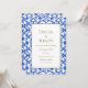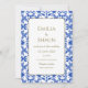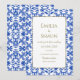 Este convite de casamento branco e azul-padrão mediterrânico italiano tem um estilo clássico de colheita siciliana e é elegante, sofisticado e tradicional.