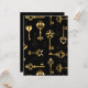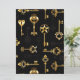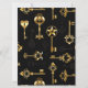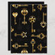 Padrão perfeito de chaves antigas, douradas e silhuetas em fundo preto.