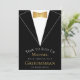 Sua parte superior sugere um terno elegante preto com camisa branca e boliche dourado de folha de ouro falsa. Na parte inferior, a mensagem "Tempo para se adequar" é arquivada acima da mensagem "seu serviço como um Padrinho de casamento é solicitado", com a palavra Padrinho de casamento em bonés maiores. O nome e a palavra Padrinho de casamento são ouros, o resto do texto é branco. o fundo é preto. No verso, há uma mensagem em um guião branco de escrita manual, também em fundo preto.
