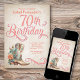 Peguem suas cabines para uma noite de excelente com este convite de aniversário de oeste do país! Possui uma linda bota de vaqueira e flores, juntamente com caligrafia vintage. Perfeito para sua vaqueira favorita ou fã de música country no seu aniversário de 70. Solicite seus convites impressos e suprimentos de festas ou faça o download de seus convites digitais agora por um dia que eles nunca esquecerão!