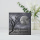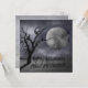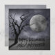 Uma ilustração assustadora do Dia das Bruxas: paisagem assustadora à noite com a lua de cheio, nuvens e uma silhueta escura de árvores com uma aranha enforcada.