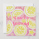 Frutado, gasoso, doce e azedo... fatias de limão, bolhas e estrelas flutuam em limonada rosa. Convite de festas com um design personalizável cor-de-rosa, amarelo, laranja e branco para você personalizar com seu próprio texto, imagens e ideias. Um lápis de cor original e desenho de tinta branca por Jess Perry.