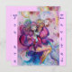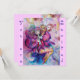 Colorido, caprichoso, engraçado palhaço rosa tocando corneta com uma coruja expressiva e notas musicais alegres, flores, folhas em cores vibrantes vermelho, fúcsia, violeta, roxo, azul, branco, pintura em aquarela por Bulgan Lumini (c)