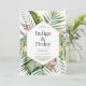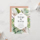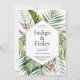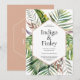 Um belo convite para casamento de aquarelas tropicais, perfeito para um casamento de praia ou destino. Apresentando folhagem verde-aquosa tropical, folhas monstera, folhas de palmeiras, folhas de bananeiras e uma moldura geométrica para um toque moderno.