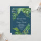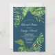 Este convite para janto de ensaio azul de palma tropical selvagem é perfeito para um ensaio de casamento de praia ou destino. A design apresenta um exótico conjunto de folhas de palmeiras de banana-d'água verde, samambaias, folhagem, plantas botânicas e verde sobre fundo azul-marinho para uma sensação tropical de verão.