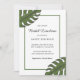 Um convite moderno para o almoço de noiva apresentando um simples design com duas folhas de palma verdes grandes, uma no canto superior esquerdo e outra no canto inferior direito e um quadro em volta dos detalhes do evento, sobre um fundo branco. A parte de trás é uma sombra de verde correspondente. Este design tropical é perfeito para uma celebração temática na praia de verão.