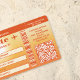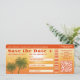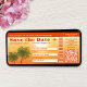 O casamento de destino do Destei salve o design do cartão de data com um tema de aparência de cartão de embarque falso. A design inclui silhuetas de palmeiras verdes tropicais, o sol, três silhuetas de aves voadoras e uma silhueta de avião. O fundo é um belo gradiente laranja que dá à design uma aparência quente ao pôr do sol da noite de verão. A design tem várias áreas de texto personalizáveis perfeitas para escrevendo a data do casamento, os nomes das pessoas que se casam e até a localização do casamento. Há também um modelo de código QR ideal para guiar convidados ao site de casamento do casal.