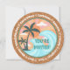 Convite de aniversário diverso para a festa na praia, com retrato colorido Ilustração de palmeiras verdes, ondas azuis, sol laranja e raios solares amarelos e rosados em um fundo de textura de cortiça falsa. Cercado por palavras relacionadas ao verão... Ondas, festas de praia, boas vibrações, coquetéis, verão, amigos, risos, sol e Surf. Personalize ou personalize este cartão com seu próprio texto e envie-o para amigos e familiares para convidá-los para a sua festa de churrasco ou de praia.