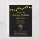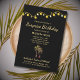 Convite de aniversário de Surpresa de Adultos Tropicais, com palmeiras elegantes design num fundo preto. Com letras personalizáveis de tipografia de ouro, você adiciona suas próprias informações. Um convite fantástico e glamouroso para planejar sua praia inspirou celebração.