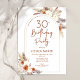 convite de festas em terracotta queimou laranja e branco. Belo design minimalista moderno com sotaques botânicos pintados à mão. Apresenta capim de pampas, folhas, rosas e fontes de script de tipografia. Tendy Bohemian estilada tema do deserto perfeito para outono, inverno, primavera ou verão. Você pode escolher convites impressos e/ou fazer o download instantâneo do modelo digital. Perfeito para uma comemoração de 30 na moda feminina.