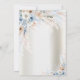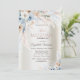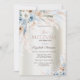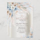 Um convite moderno, chico e glamouroso com grama pampas e rosas azuis sobre fundo de marfim.