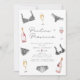Este chá de panela elegante é perfeito para os chás de panela de vinho, espumante e lingerie. Tem o título manuscrito "Panties and Prosecco" e garrafas de aquarela e óculos de vinho espumante e lingerie. A parte de trás do convite é um fundo de aquarela cor-de-rosa.