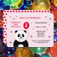 Este convite de festas primeiro aniversario bonito tem um panda sorridente com um balão de primeiro aniversario vermelho. No topo, o texto editável é "Ajude-nos a celebrar!" O texto para "Primeiro Aniversário de Madison" também é editável. O fundo do cartão é cor-de-rosa claro, com estrelas vermelho, branco e azul dispersas. A parte traseira da placa tem um padrão de bolinhas em vermelho em rosa, e há uma estrela solteiro no centro.