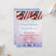 Este pano de festa vermelho, branco e azul patriótico ao longo da parte superior e estrelas correspondentes ao longo da parte inferior sobre um fundo complementar definem o design da frente deste convite de casamento. O fundo do verso do convite combina com o design da frente. Personalize o design com os detalhes do seu casamento nos campos do modelo.