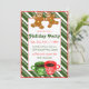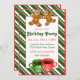 Convite de férias com biscoitos gigantes de pão de gengibre e canecas de café ou cacau quente em fundo listrado de cana doce verde.