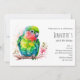 Convite de aniversário com uma bela ilustração de papagaio. Um pequeno papagaio verde com cores azuis e amarelas se misturando. O pescoço tem um tom vibrante de rosa avermelhado.