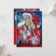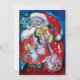 Colorida, caprichosa e artística pintura acrílica, Papai Noel está tocando violino na noite de inverno nevada, uma coruja, ornamentos florais, plantas de inverno, frutos de azevinho em cores brilhantes vermelho, verde, branco, azul, amarelo.