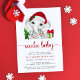 Festa natalícia elegante feliz bebê bebezinha convite com "Papais noeis Bebê" em um roteiro vermelho com pestanas, uma aquarela de um elefante bebê com chapéu de Papai Noel, uma bengala vermelha e verde e apresenta, o nome da futura mãe em uma elegante tipografia vermelha e os detalhes do borrifo em uma simples tipografia moderna.