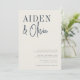 Um belo convite de casamento baseado na tipografia moderna em azul marinho enfumaçado e branco quente. Seus nomes aparecem no canto superior esquerdo em um par atraente de scripts manuscritos e tipos clássicos de serifa. Digite seus nomes e use a Ferramenta Design para ajustar o tamanho e o posicionamento, se necessário. Personalize com seus detalhes de casamento em letras clássicas de serif alinhadas no canto inferior direito.