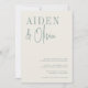 Um belo convite de casamento baseado na tipografia moderna em verde-poeirento, branco-quente e verde-floresta. Seus nomes aparecem no canto superior esquerdo em um par atraente de scripts manuscritos e tipos clássicos de serifa. Digite seus nomes e use a Ferramenta Design para ajustar o tamanho e o posicionamento, se necessário. Personalize com seus detalhes de casamento em letras clássicas de serif alinhadas no canto inferior direito.
