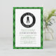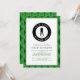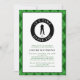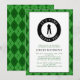 Convite de aniversário de golfe masculino personalizado com design apresenta uma silhueta de golfista masculino em preto clássico definido em uma forma branca bordeada com texto curvo humorístico "É Hora de Par Tee!" em fonte branca crocante em um círculo preto. Personalize o modelo com o nome e detalhes em letras clássicas pretas e verdes. O convite é bordeado com um xadrez estilo argyle verde de duas tonalidades que também se repete no verso do convite.