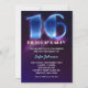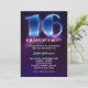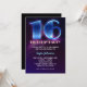Azul elétrico e convite roxo para uma festa negra de neon. Comemoração moderna e legal de 16 de aniversário.