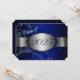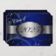 Convite à graduação de azul e prata com floral azul claro e escuro e uma fita prateada passando mostrando o ano de graduação. A parte traseira do cartão é azul com fonte prateada clara para as pessoas preencherem os anúncios de graduação.