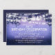Convites de festas de aniversários rupestres com cordas de luz nos ramos da velha árvore e flores românticas em uma noite azul. Na moda e convite de aniversário criativo bonitos para a celebração do estilo country em um jardim ou celeiro. Entre em contato comigo se precisar de ajuda para personalizar ou tiver uma solicitação de cor personalizada.