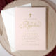 Convites para Batismo Elegante: Este convite para batismo de rosa claro apresenta um guião de ouro elegante e uma cruz simples, personalizada com o nome da sua filha e os detalhes do evento. Um design macio e eterno perfeito para uma celebração clássica do batismo de uma menina.